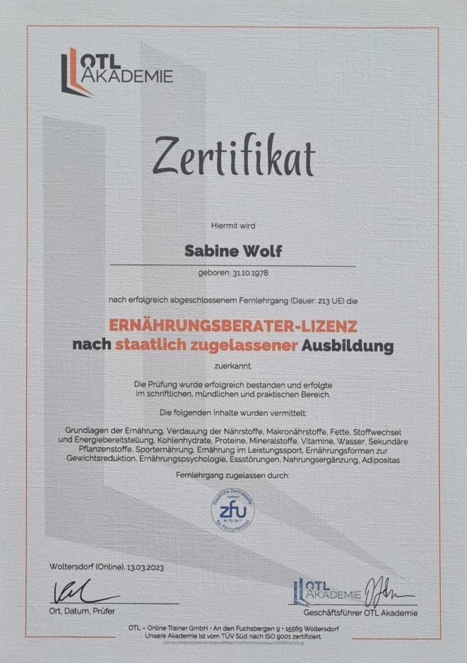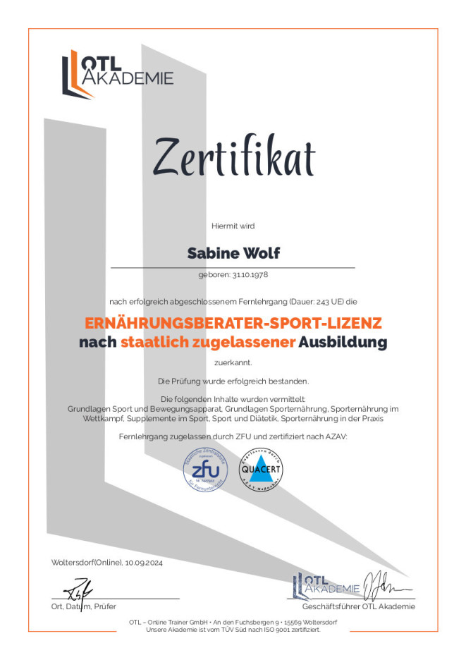 OTL Prüfdozentin für Ernährungsberater / Ernährungsberater Sport Dez 2023 - Nov 2025